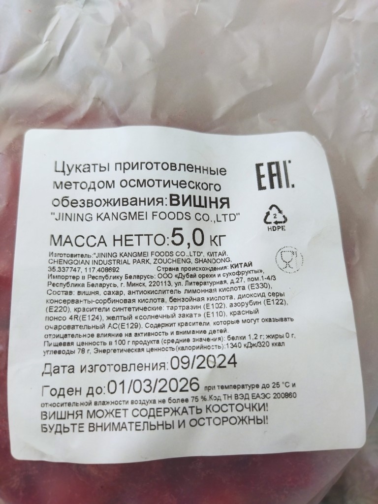 Могилевской областной инспекцией Госстандарта в результате проведенных надзорных мероприятий выявлена опасная продукция – Цукаты приготовленные методом осмотического обезвоживания: Вишня, изготовитель «JINING KANGMEI FOODS CO., LTD», Китай, которая не соответствует требованиям технических регламентов Таможенного союза ТР ТС 021/2011 «О безопасности пищевой продукции», ТР ТС 022/2011 «Пищевая продукция в части ее маркировки», ТР ТС 029/2012 «Требования безопасности пищевых добавок, ароматизаторов и технологических вспомогательных средств» по безопасности и маркировке в части предоставления достоверной информации о составе продукта. В результате проведенных испытаний обнаружен заявленный изготовителем в маркировке краситель понсо 4R (Е124) в количестве, превышающем норму в 1,8 раза, заявленные изготовителем в маркировке синтетические красители тартразин (Е 102), азорубин (Е122), солнечный закат (Е110), очаровательный красный АС (Е129) не обнаружены.