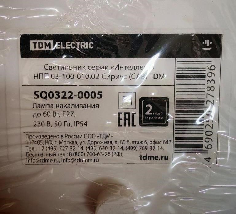 светильник торговой марки «TDM ELECTRIC», серии «Интеллект» НПП 03-100-010.02 Сириус (САВ) TDM артикул SQ0322-0005, изготовитель ООО «ТДМ» (Российская Федерация, г. Москва).