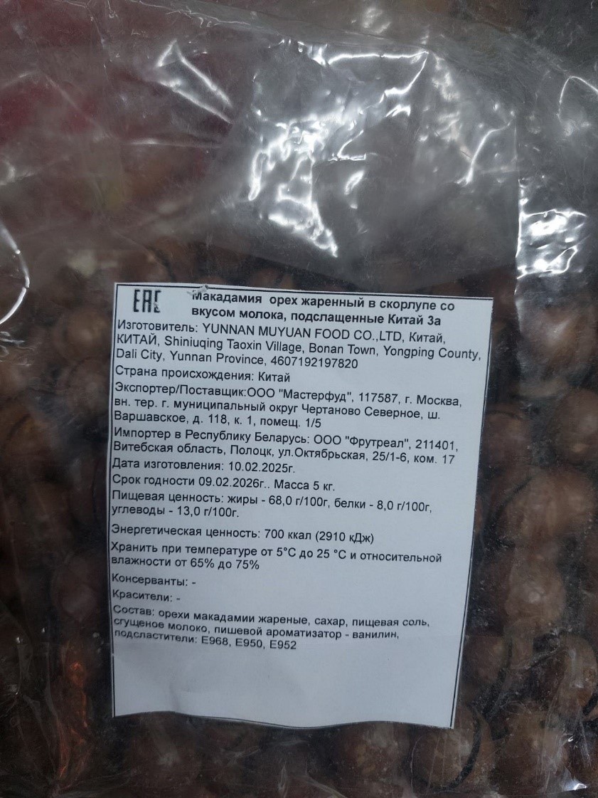 • макадамия орех жаренный в скорлупе со вкусом молока, подслащенные, изготовитель «YUNNAN MUYUAN FOOD CO., LTD» (Китай),