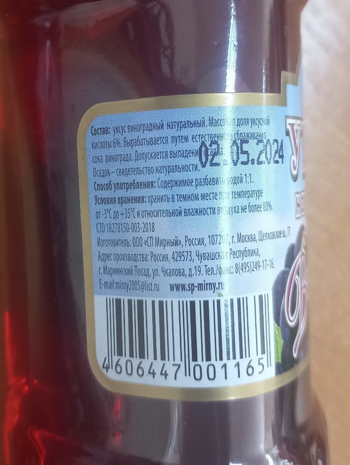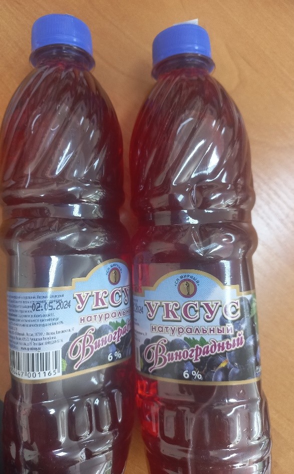 • уксус натуральный виноградный 6%, изготовитель ООО «СП Мирный» (Российская Федерация, г. Москва, адрес производства: Российская Федерация, Чувашская Республика, г. Мариинский Посад),