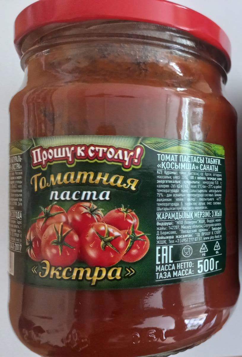 • томатная паста натуральная торговой марки «Прошу к столу» категория «ЭКСТРА», изготовитель ООО «НПО Позитрон» (Российская Федерация, г. Москва, адрес производства: Российская Федерация, Московская обл., г. Серпухов, д. Борисово, «Посадский лес»),